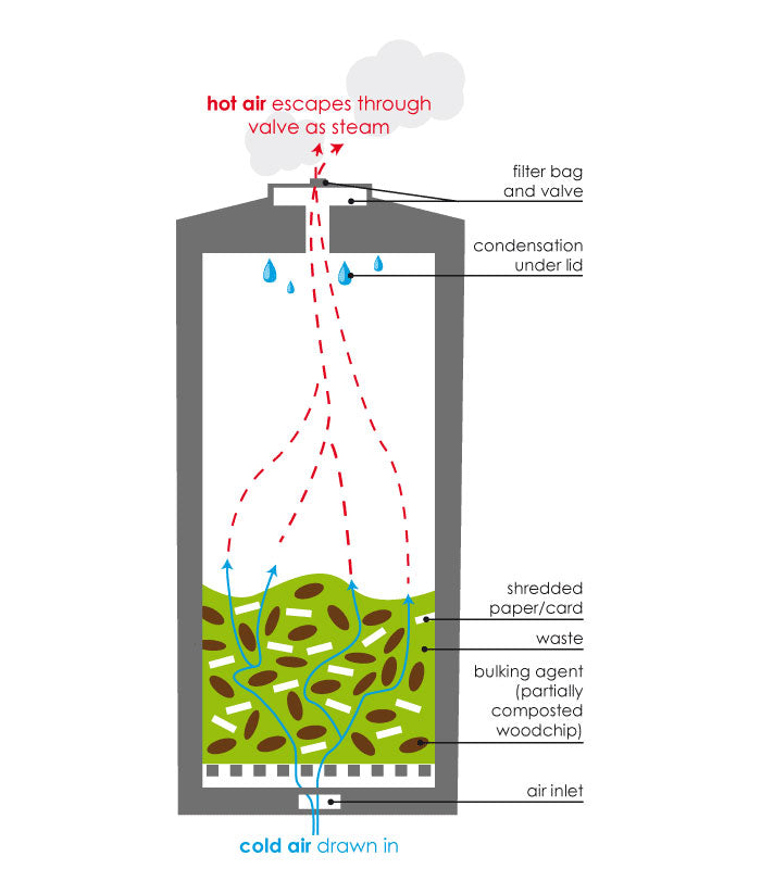 A chimney effect of hot air rising pulls air and oxygen through the intake in the base, to keep HOTBIN working aerobically.